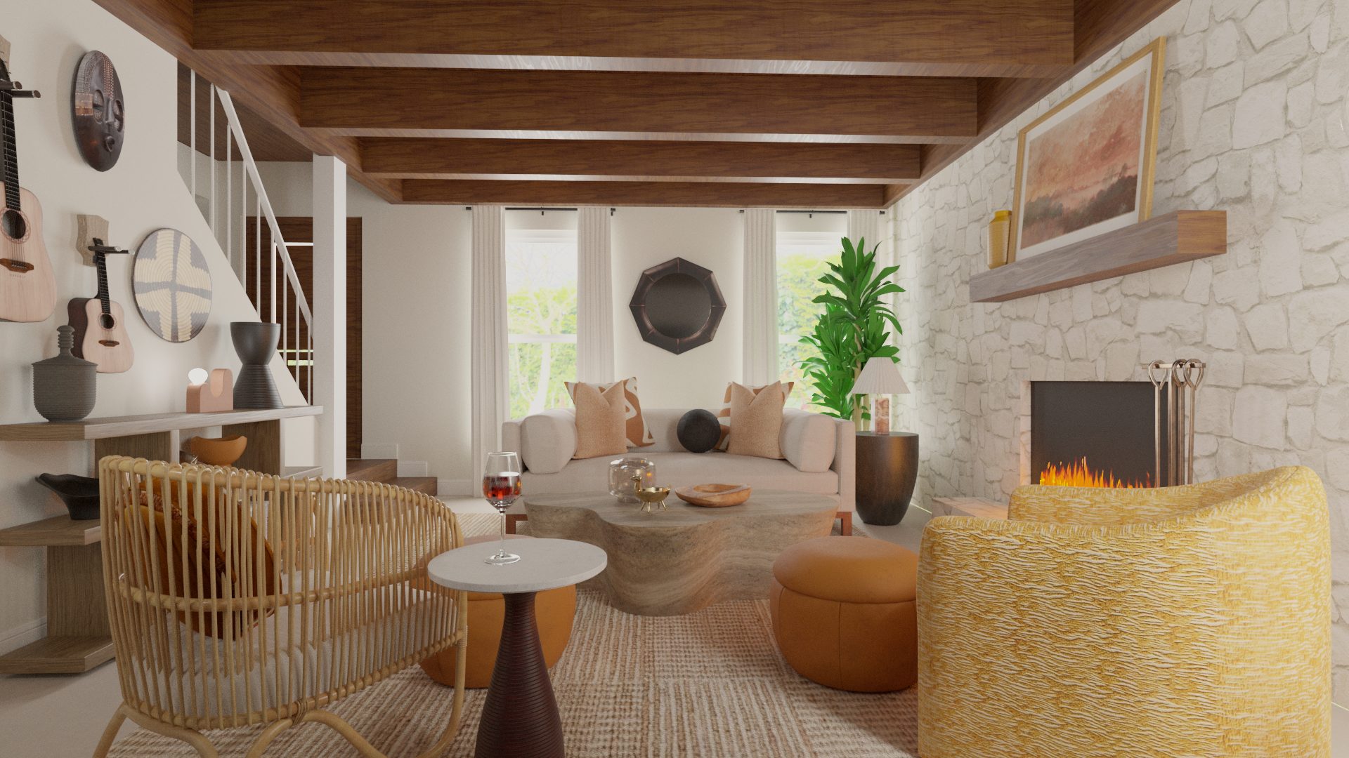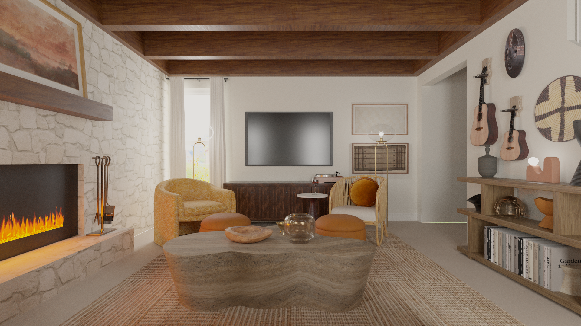 On one side of the home, we leaned into textured neutrals, layered materials, and pieces collected from the couple’s travels. The living room became a calm, grounded space with a “collected over time” feel — perfect for slow mornings, movie nights, and hosting close friends. Unique art finds and meaningful objects give the room soul, while the palette keeps everything timeless, tactile, and inviting.